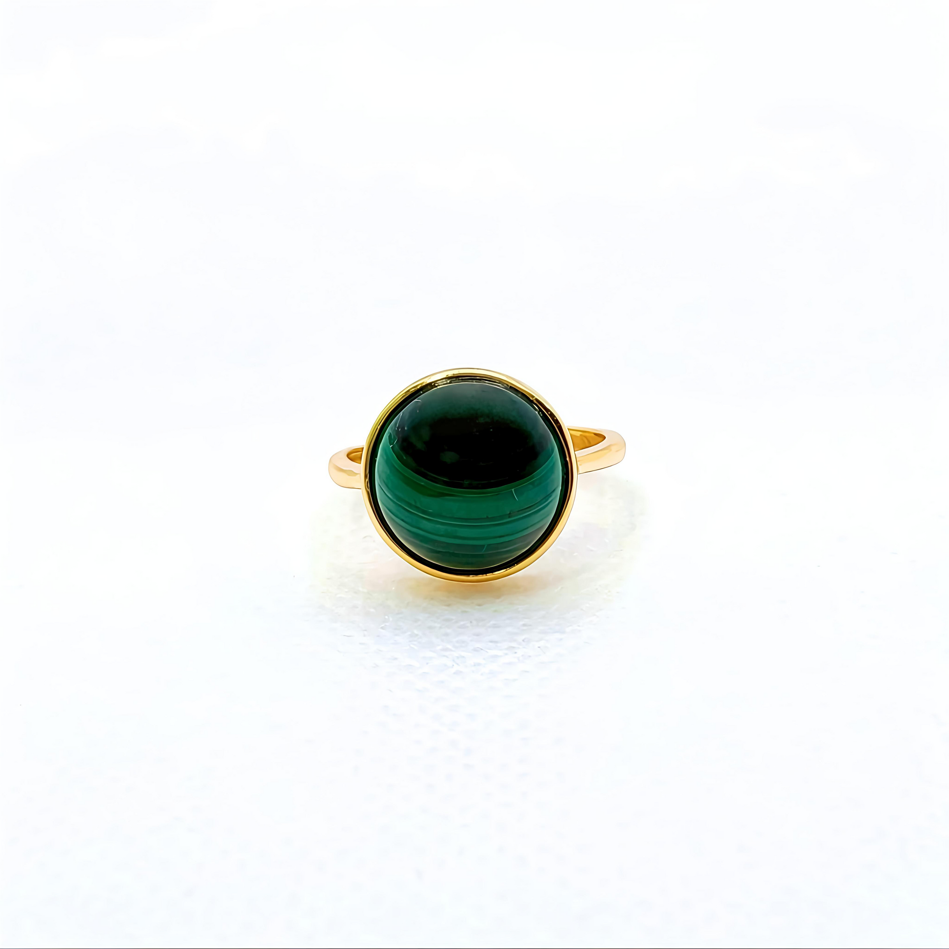 Rich green malachite, marked by its natural banding, is polished to a luminous finish and set in a sleek gold bezel. Bold yet grounded, this ring reflects strength in stillness and the beauty of transformation - a confident statement with timeless appeal.
