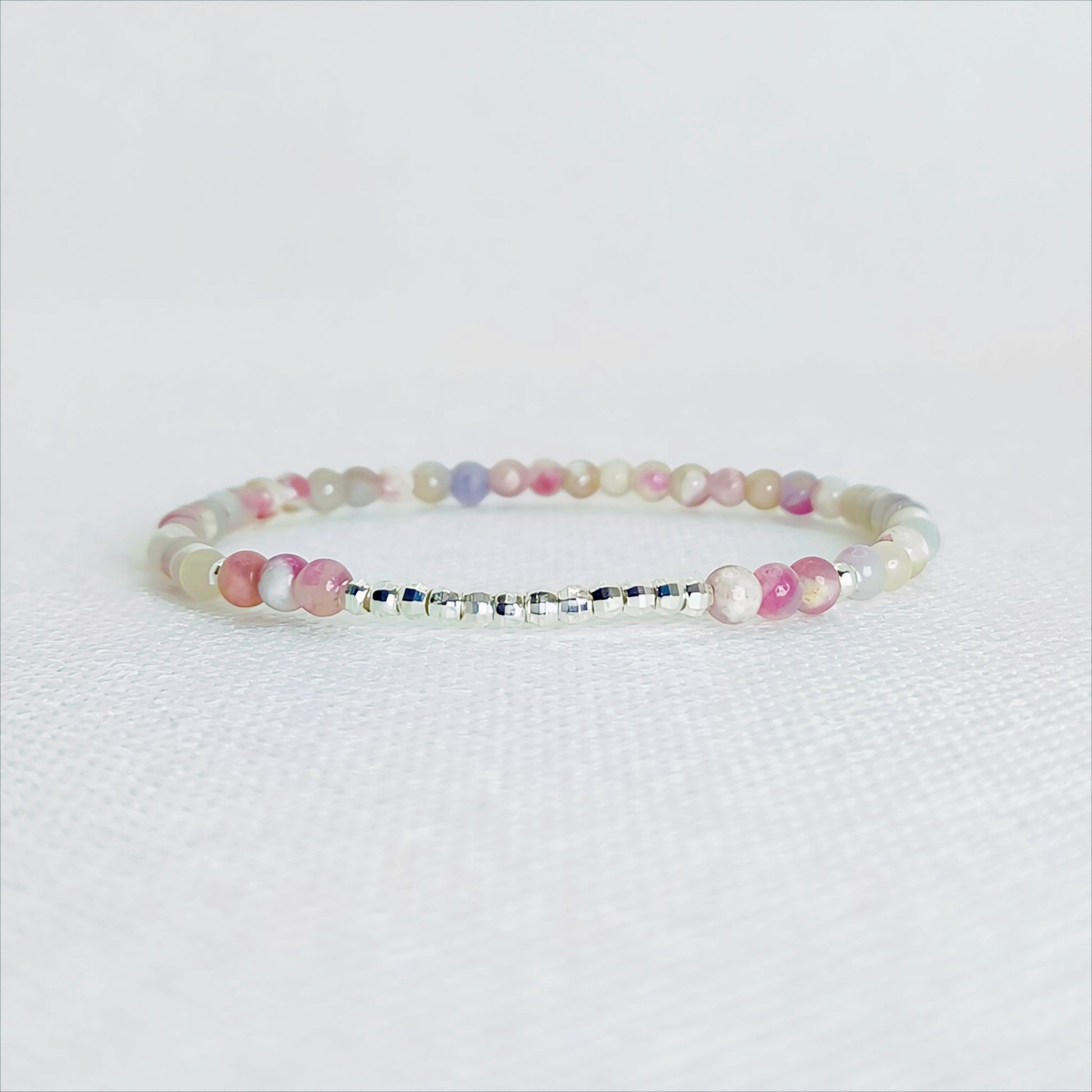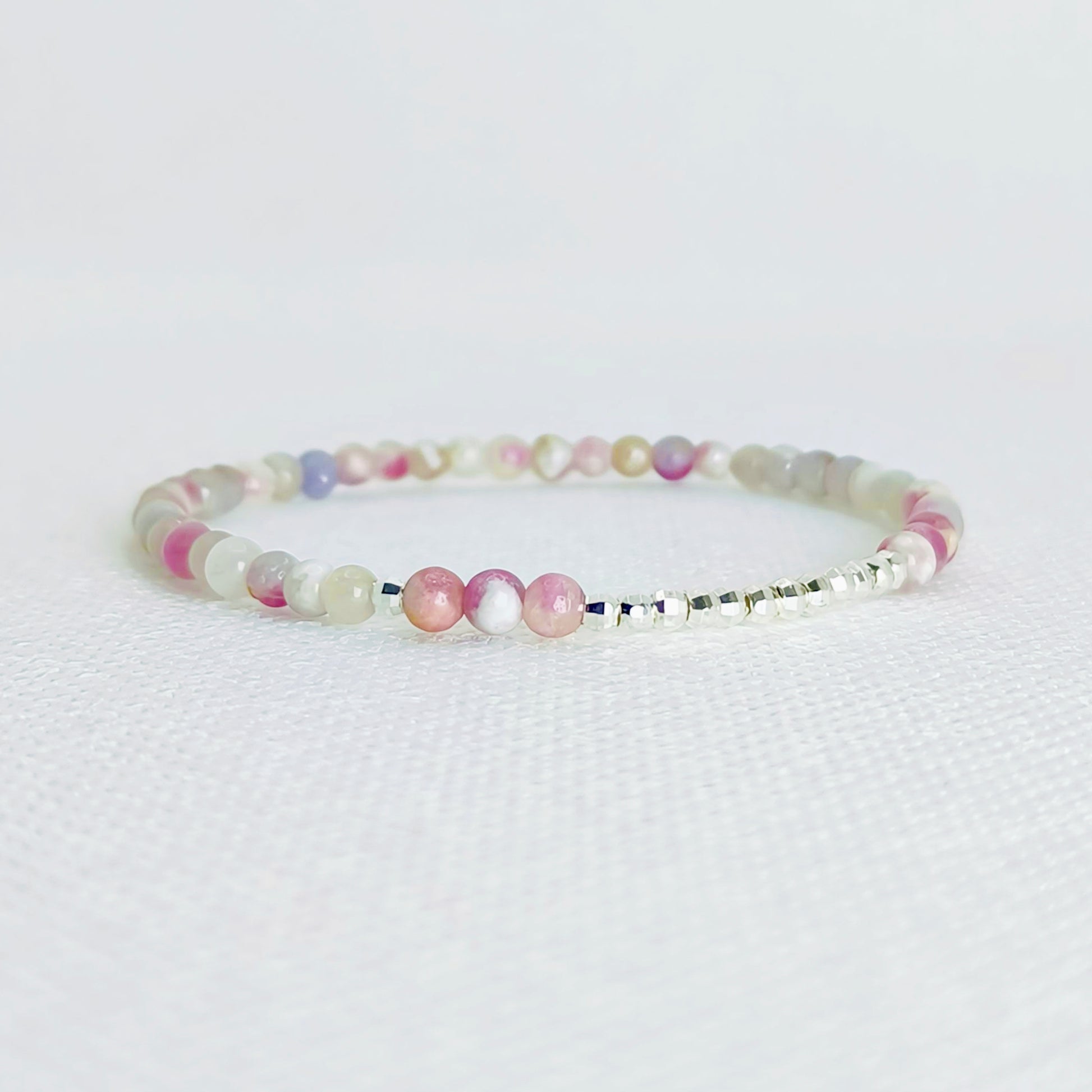 Delicate 3mm pink tourmaline beads in soft pastel tones, contrasted with sleek silver-toned accents for a graceful and refined look. Wear it solo or stacked to invite gentle harmony.
