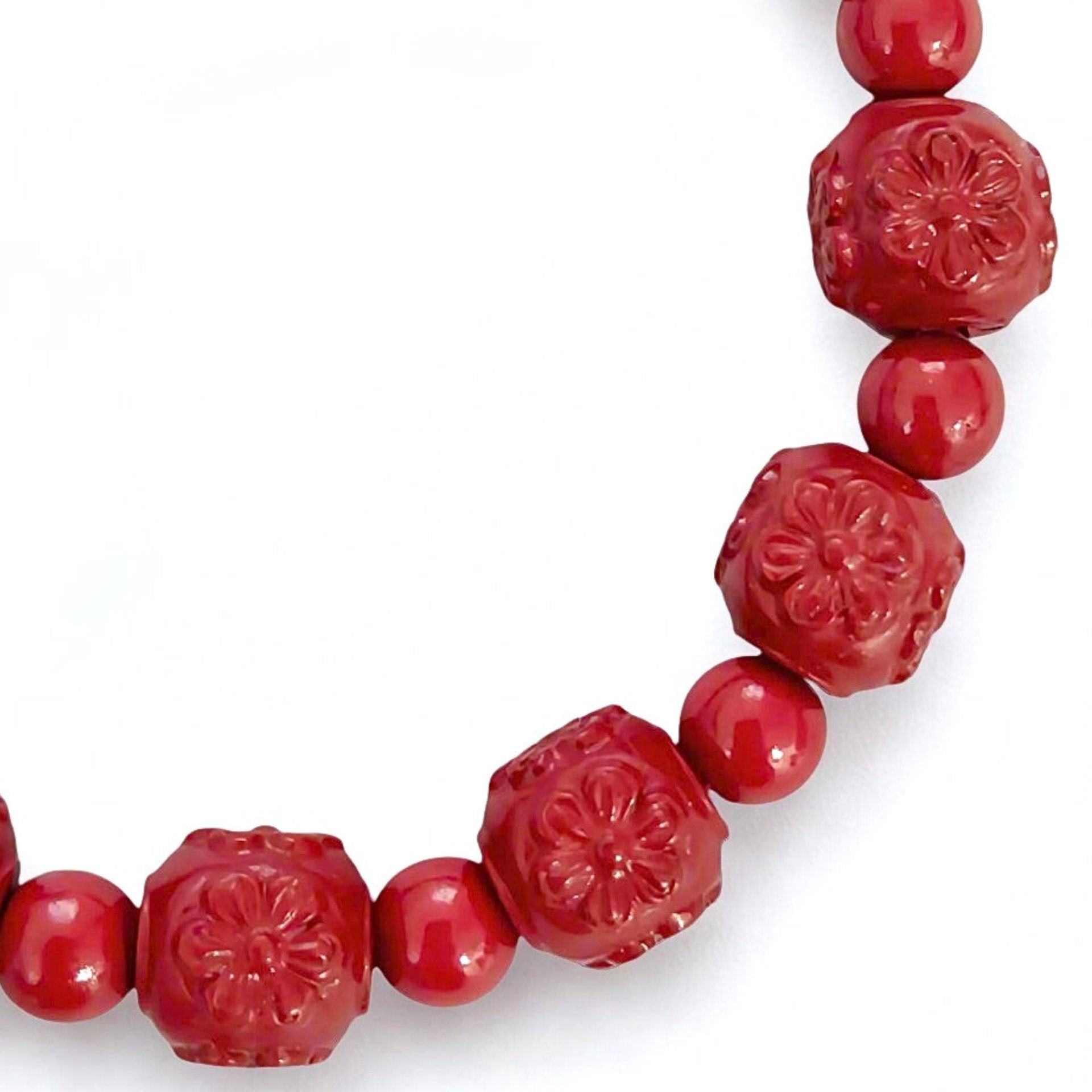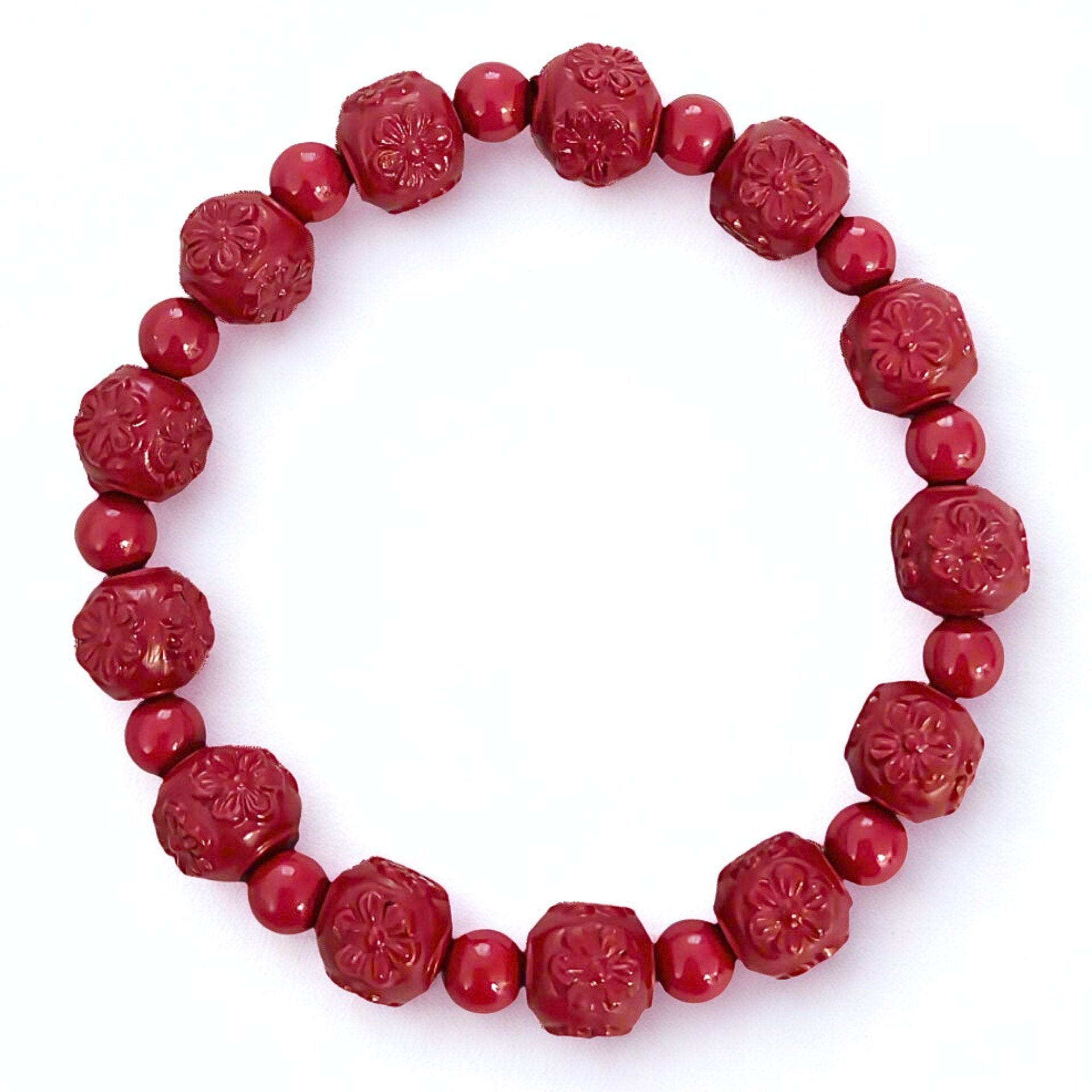 Elevate your style with this Cinnabar Beaded Bracelet, featuring 10mm floral-carved beads that symbolize growth, renewal, and elegance. The rich red hue, paired with smooth accents, creates a harmonious and striking accessory for any occasion. A meaningful blend of heritage artistry and modern sophistication.