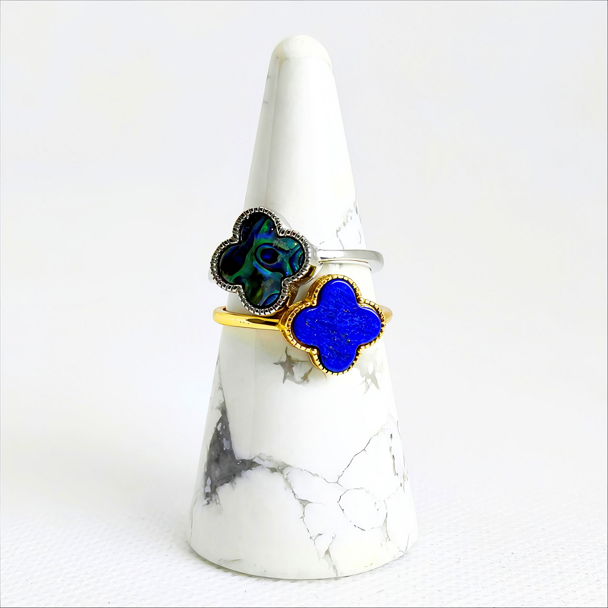 A timeless four-petal clover design set with polished gemstone inlay and refined beaded detailing. Each stone carries its own natural tone and character, making every ring a subtle expression of luck, balance, and everyday elegance. Perfect worn alone or stacked with favourites.