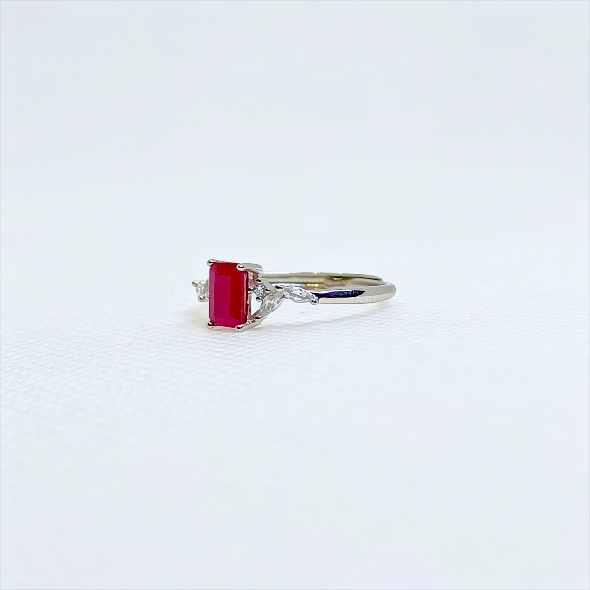 A classic silhouette reimagined with modern grace. Crimson Heirloom features a striking 6×4mm emerald-cut ruby, its rich red hue glowing with quiet intensity. Set between shimmering zircon accents, the centre stone comes alive with contrast — fiery warmth framed by delicate brilliance.
