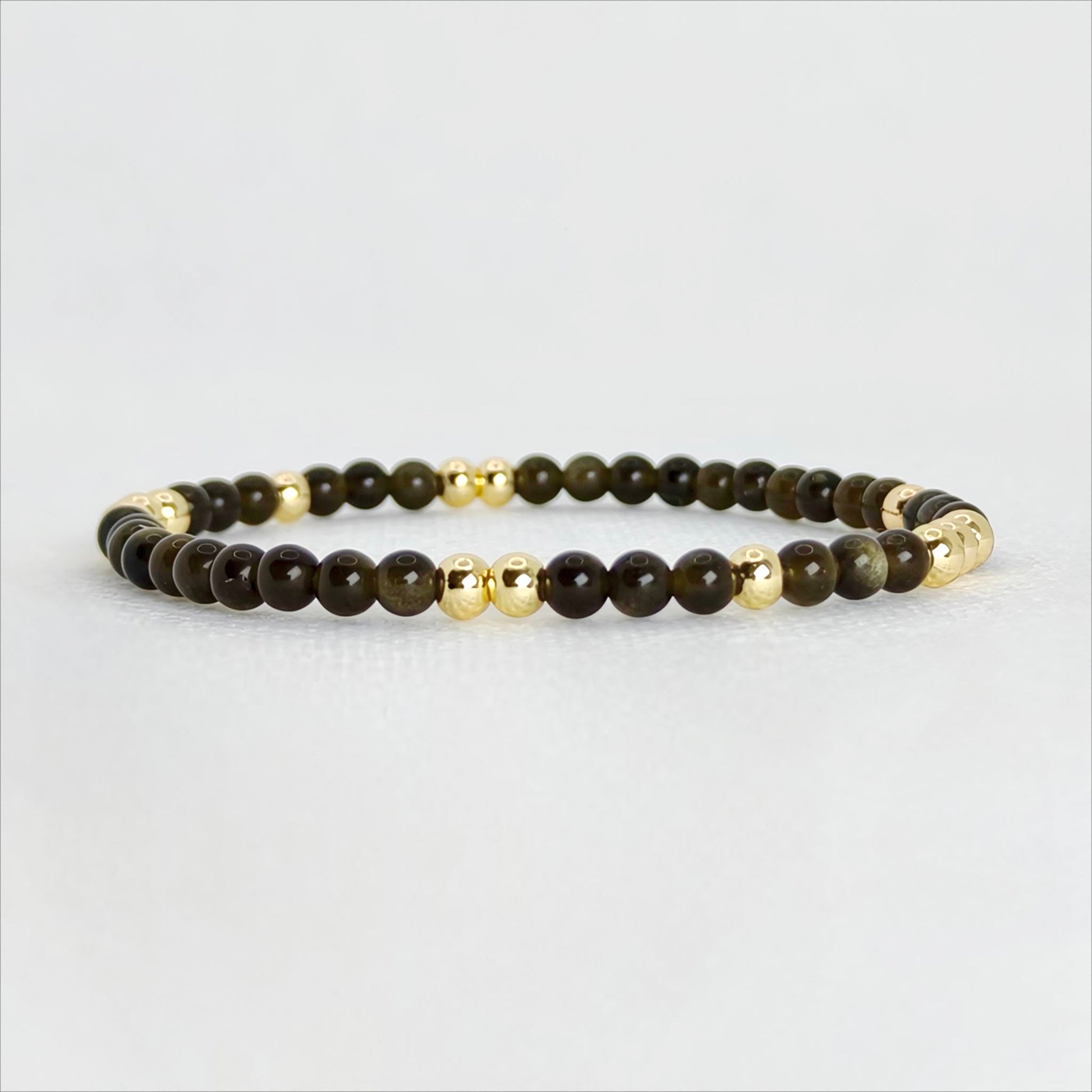 Smooth 4mm golden obsidian beads with warm gold-toned accents for grounded confidence and subtle fire. Wear it solo for a bold, sleek look or stack it to add depth and quiet strength to your bracelet story.