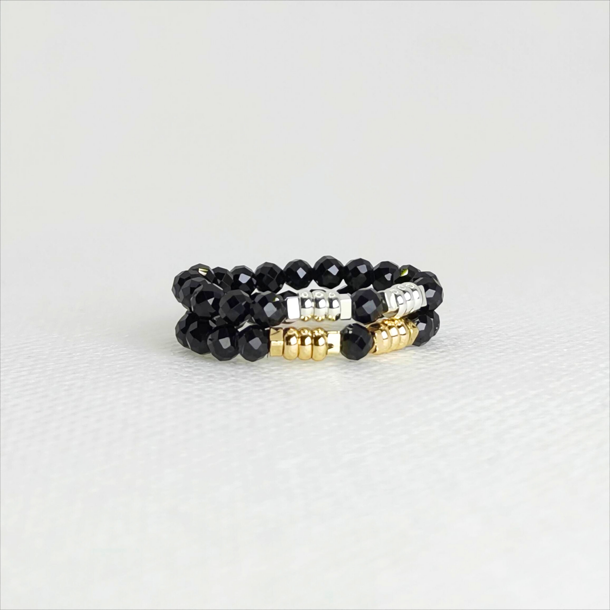 Faceted 3mm black spinel beads form a sleek ring of quiet protection, accented with polished gold or silver tones. Wear it alone for a minimalist touch or stack it to deepen your midnight talisman story.