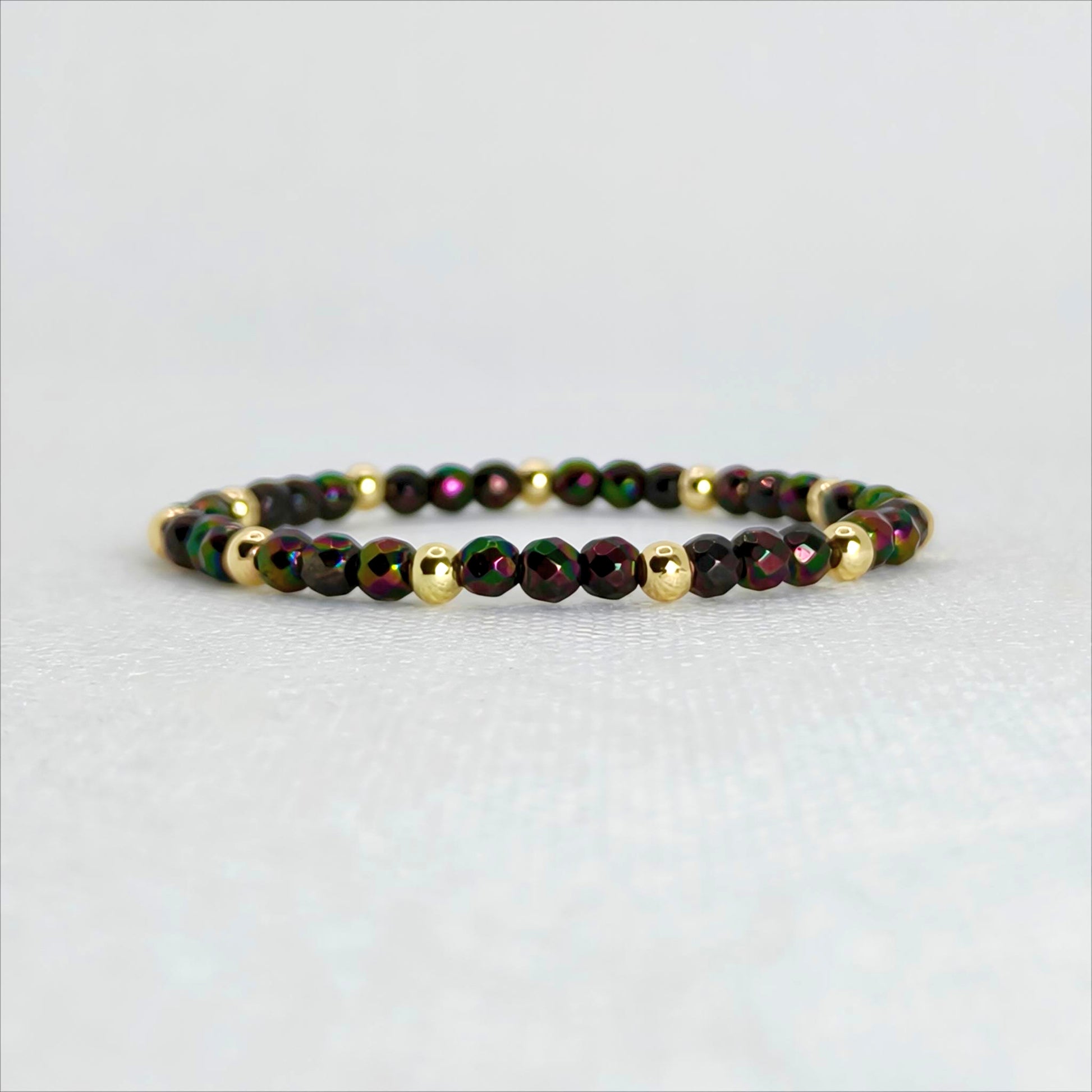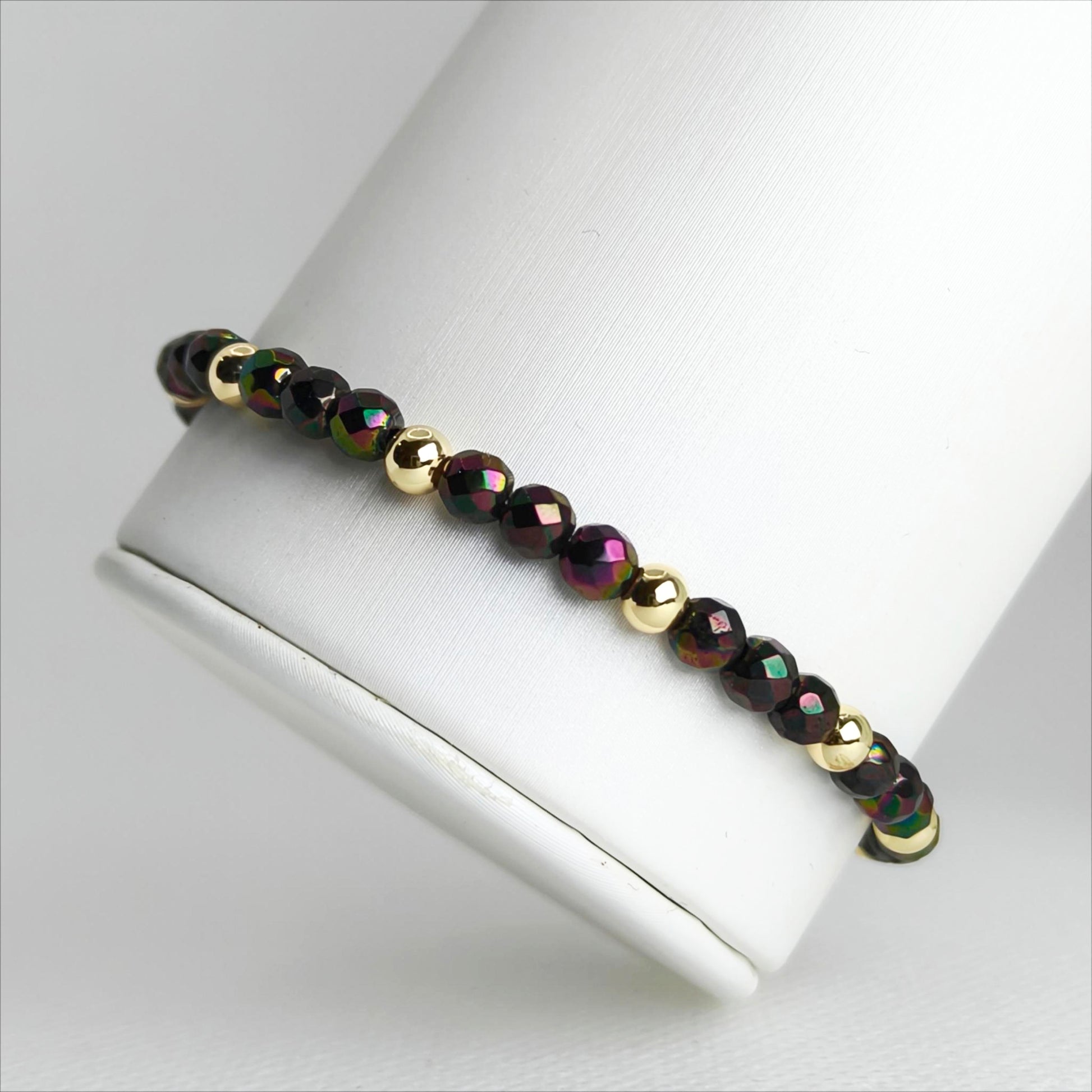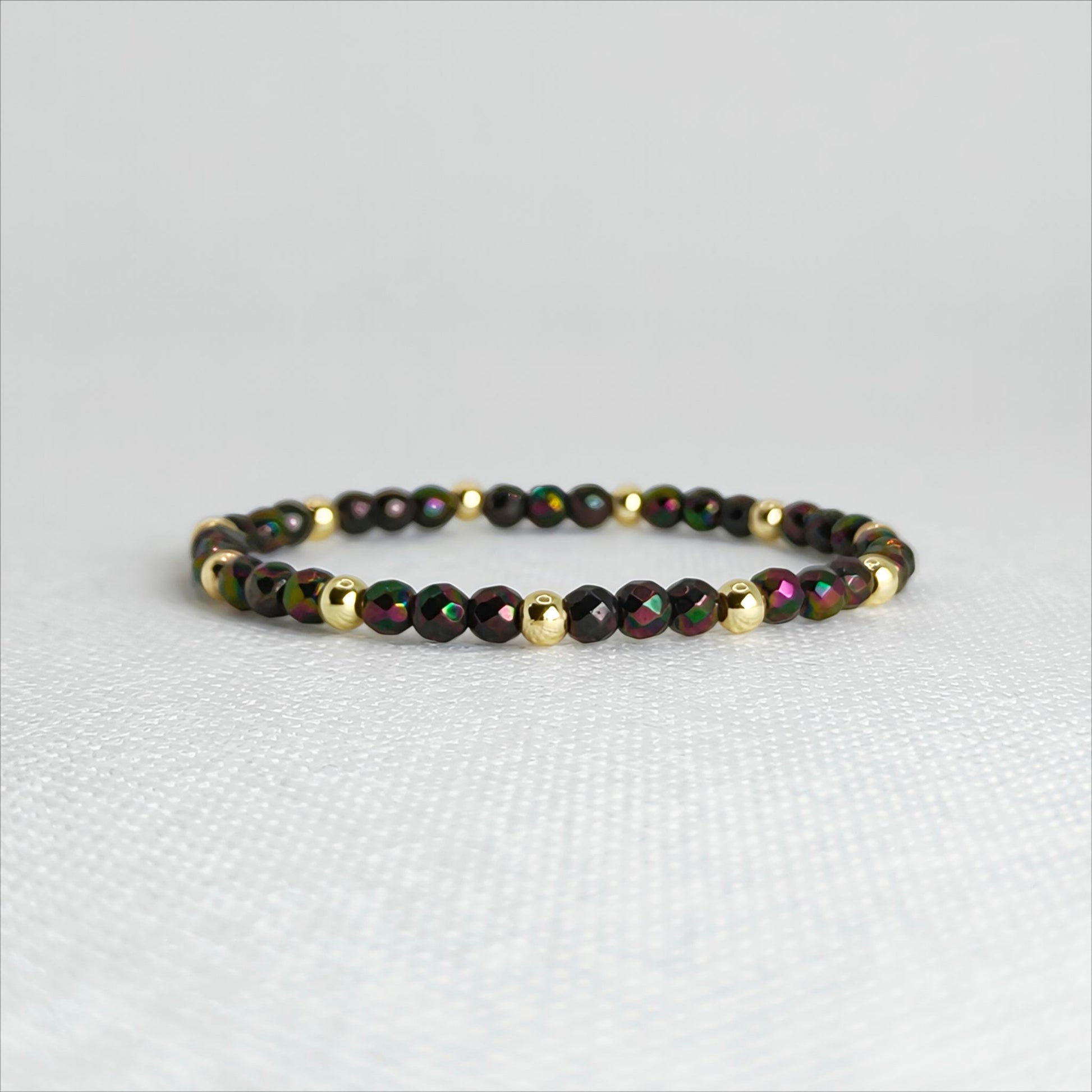 Faceted 4mm hematite beads with an iridescent prism finish, paired with polished gold-toned accents for a sleek and radiant look. Wear it solo for a subtle shimmer or stack it to add depth and dimension to your bracelet story.
