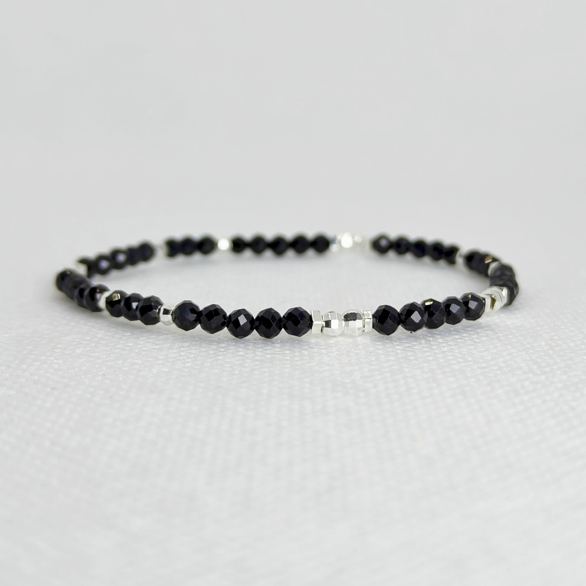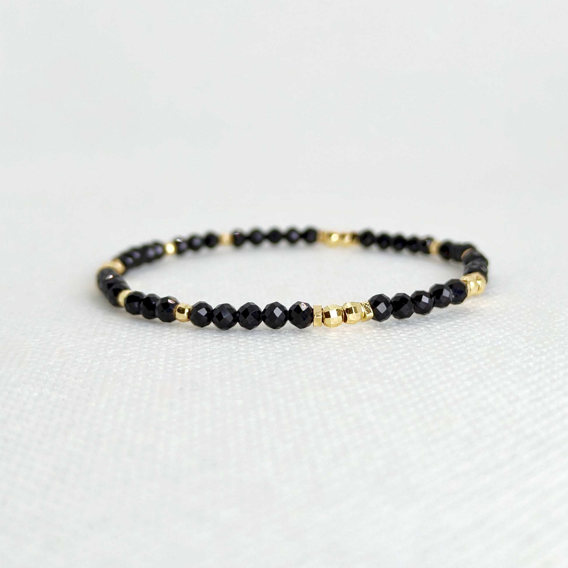 Smooth 3mm black spinel beads with round metallic accents for a clean, minimal shield of grounding energy. A versatile minimalist piece that adds a quiet strength to any stack or stands confidently on its own.