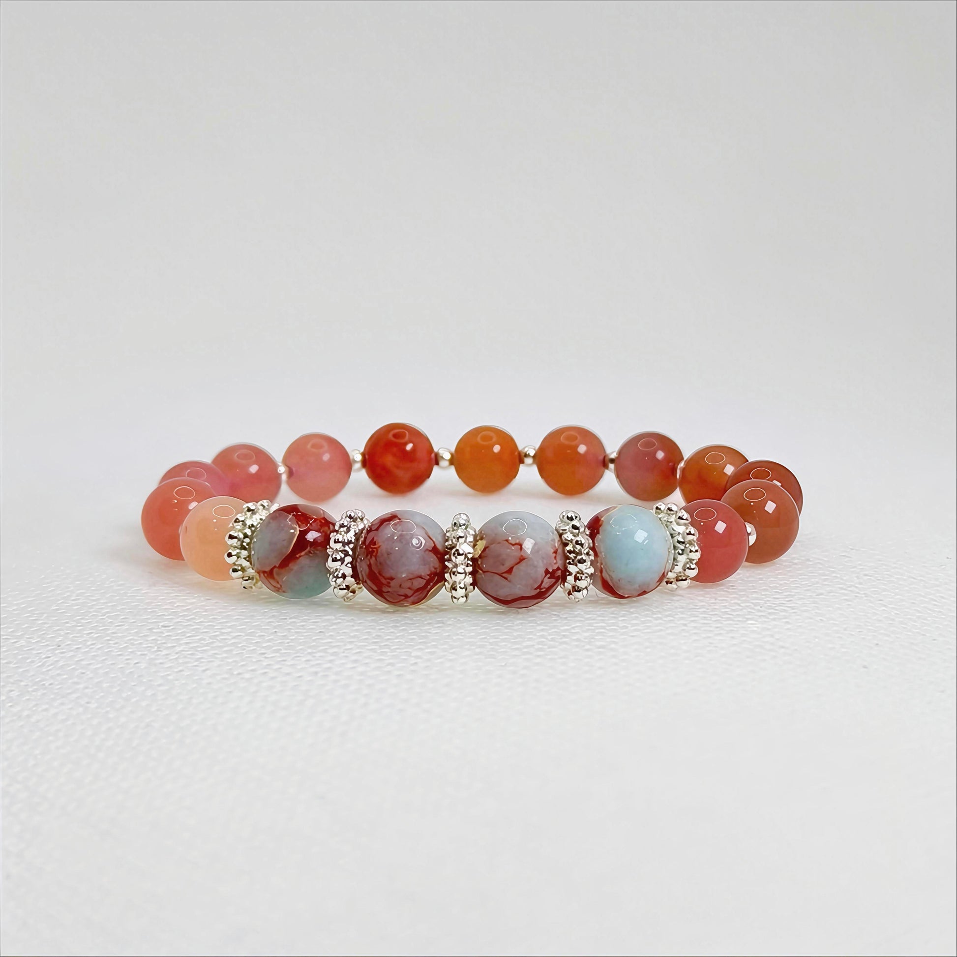 Warm, glowing hues come together in the Miststone Ember Bracelet, where richly marbled Shuo Shan stones blend seamlessly with the sunset tones of Yanyuan Agate. The natural swirls of red, grey, and soft blue in Shuo Shan bring a grounding, earthy presence, while Yanyuan Agate adds a gentle radiance reminiscent of evening light settling across a quiet landscape.
