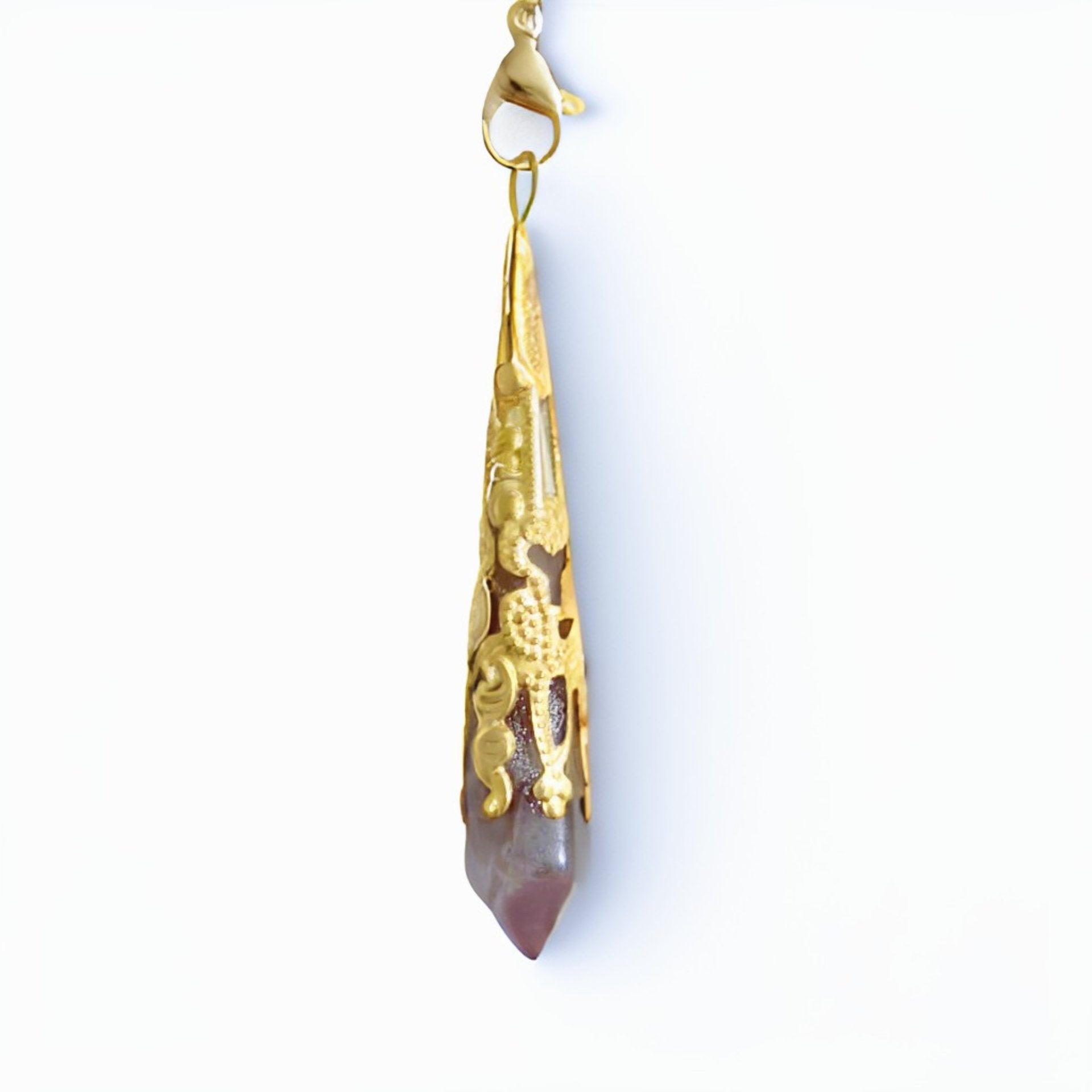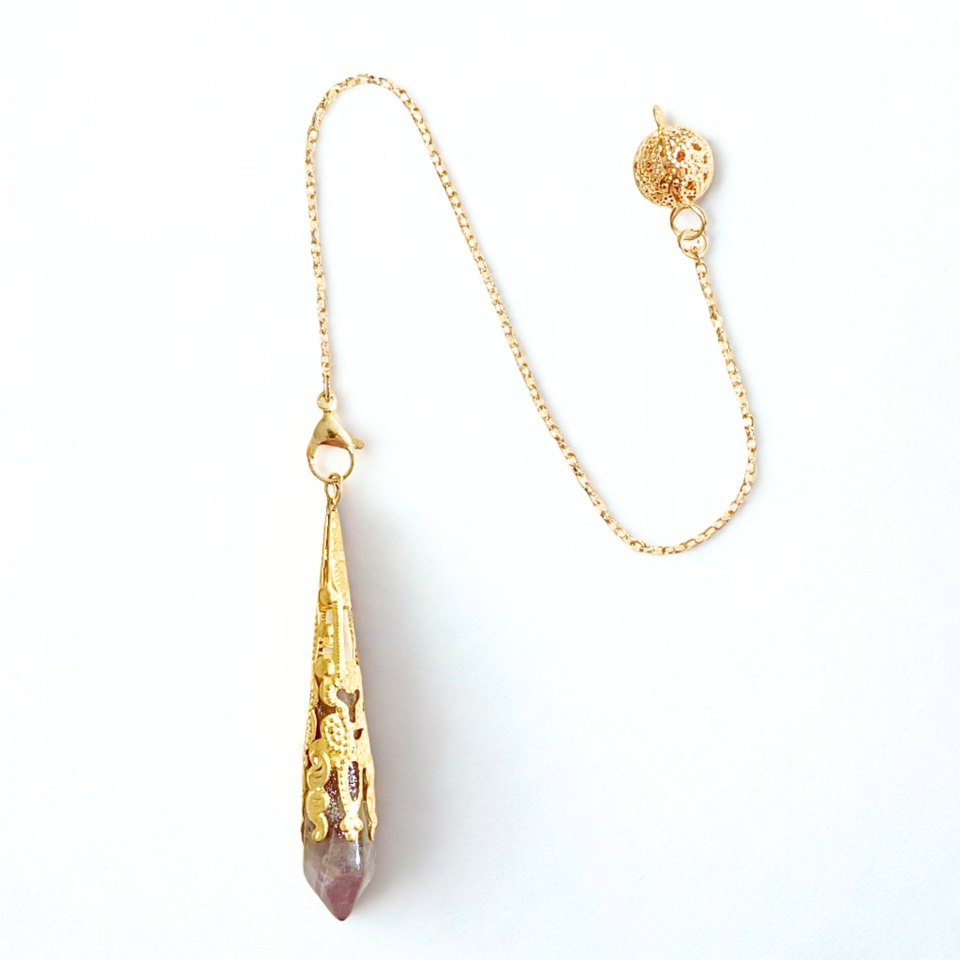 The Mystic Drop Pendulum showcases a faceted gemstone set within delicate gold-plated filigree, hanging from a slender chain. Perfect for spiritual guidance, meditation, or as a stylish accent, it brings calm to your space and intention to your hand.