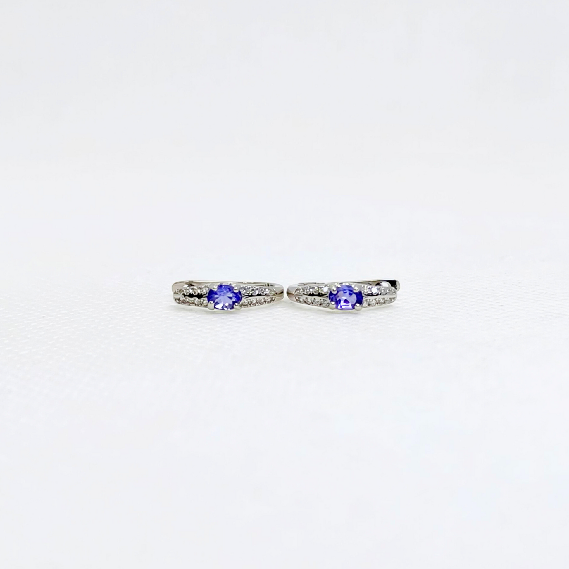 A soft arc of twilight sky captured in a single gemstone. Twilight Gleam pairs a polished hoop with a luminous tanzanite centrepiece, its violet-blue glow shifting gently with the light. Along the curve, delicate accents add a whisper of sparkle, enhancing the stone’s natural depth and dreamlike radiance.