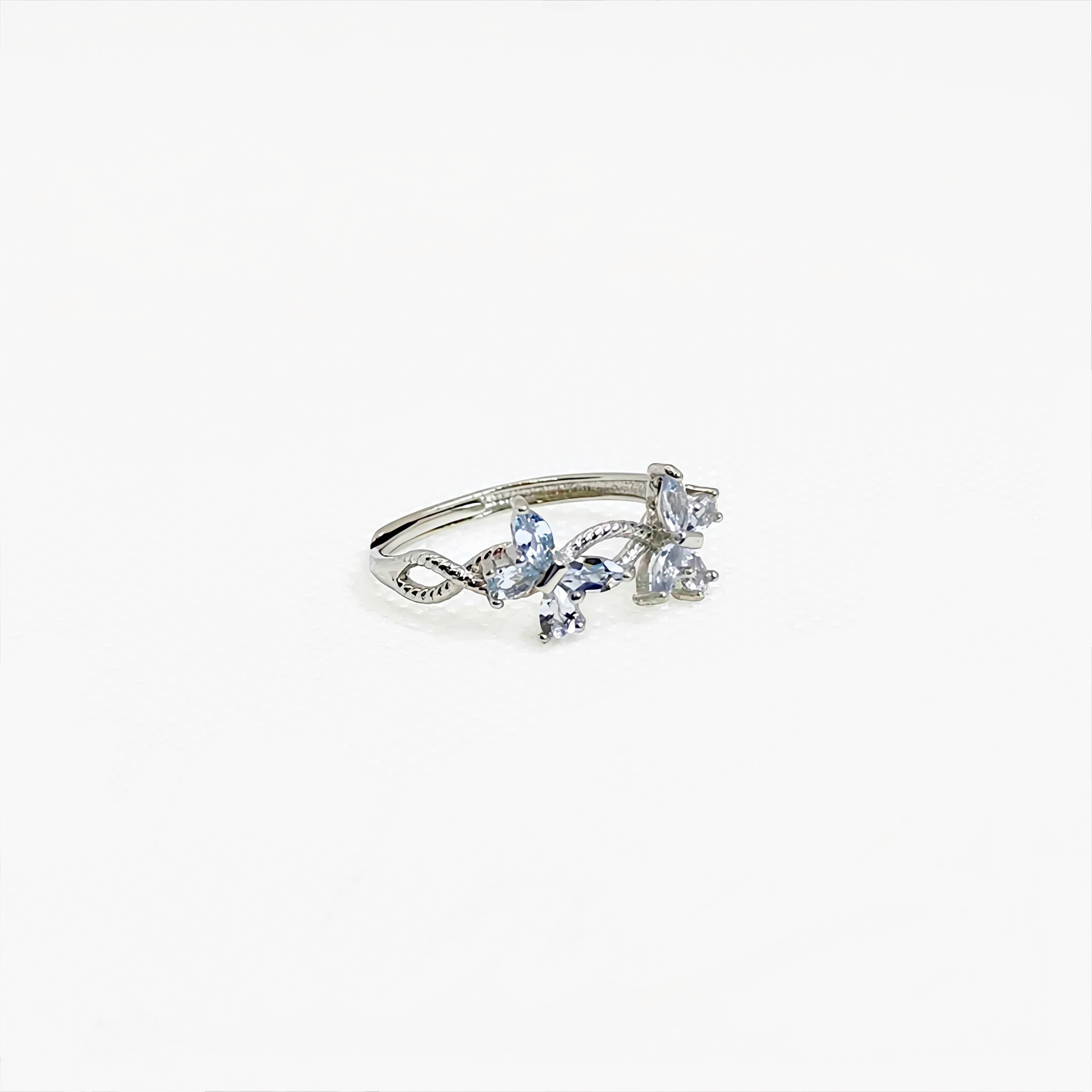 The Wingveil Flutter Ring captures the fleeting beauty of butterflies in motion. Eight delicate aquamarine stones form gentle wings that shimmer softly with every movement, reflecting clarity, calm, and quiet grace.